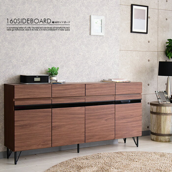 サイドボード ミドルボード キャビネット リビングチェスト 幅160cm 木目調 ウォールナット調 ホワイト 引き出し スモークガラス 脚付き アイアン ブルックリン おしゃれ モダン 北欧風 シンプル