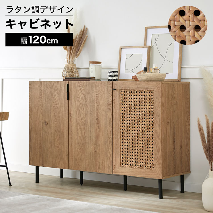 送料無料 収納棚 チェスト キャビネット サイドボード リビングボード リビング 棚 収納 サイドチェスト タンス 120cm ラタン調 ナチュラル 木製 コード穴 脚付き スチール脚 木目調